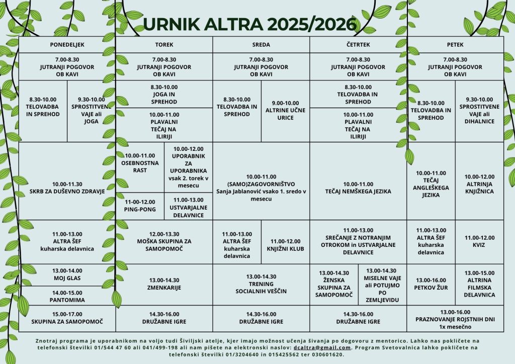 Z začetkom nove sezone z veseljem predstavljamo urnik aktivnosti društva Altra za leto 2025/2026. Naši programi so namenjeni vsem, ki želite krepiti svoje duševno zdravje, razvijati ustvarjalnost, spoznavati nove ljudi in poiskati podporo v spodbudnem in prijaznem okolju.