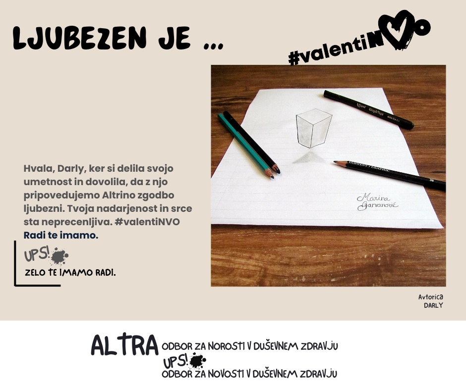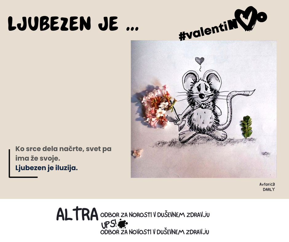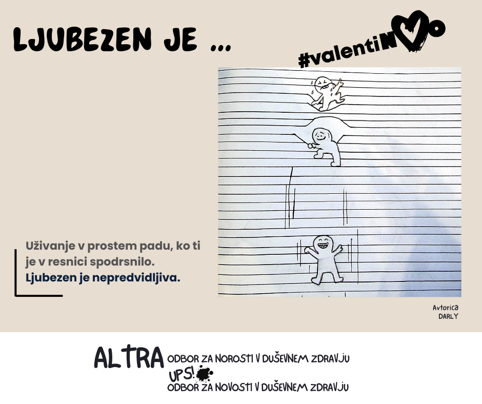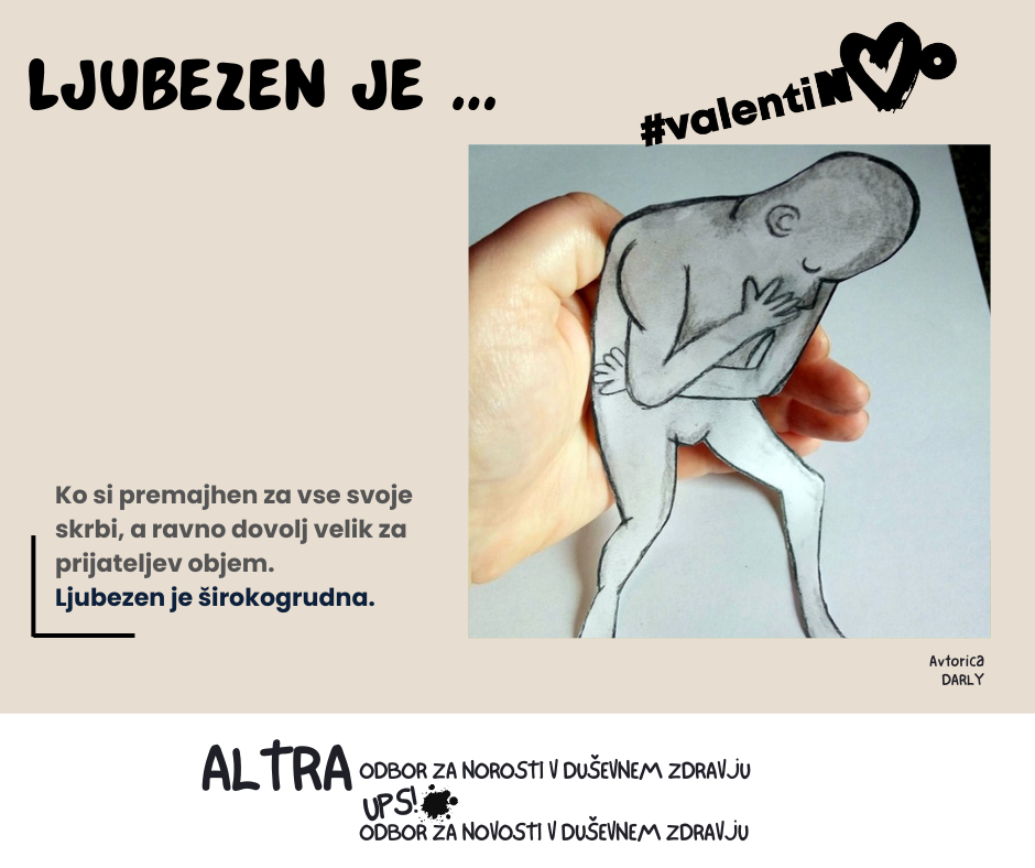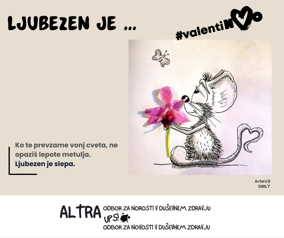 Altrina valentinova kampanja je na poziv CNVOS nastala kot nagovor različnim oblikam ljubezni – tistim tihim, zapletenim, vsakdanjim, veselim in humornim in včasih tudi nerodnim. Ljubezni do sebe, do drugih, do skupnosti, do sprememb. Vsem tistim oblikam ljubezni, ki so tesno povezane tudi z duševnim zdravjem. Odločili smo se za nameren odmik od prevzetega romantičnega razumevanja ljubezni, ki ga zapoveduje potrošniški način praznovanja na dan, ko praznuje svoj god sveti Valentin – valentinovo.