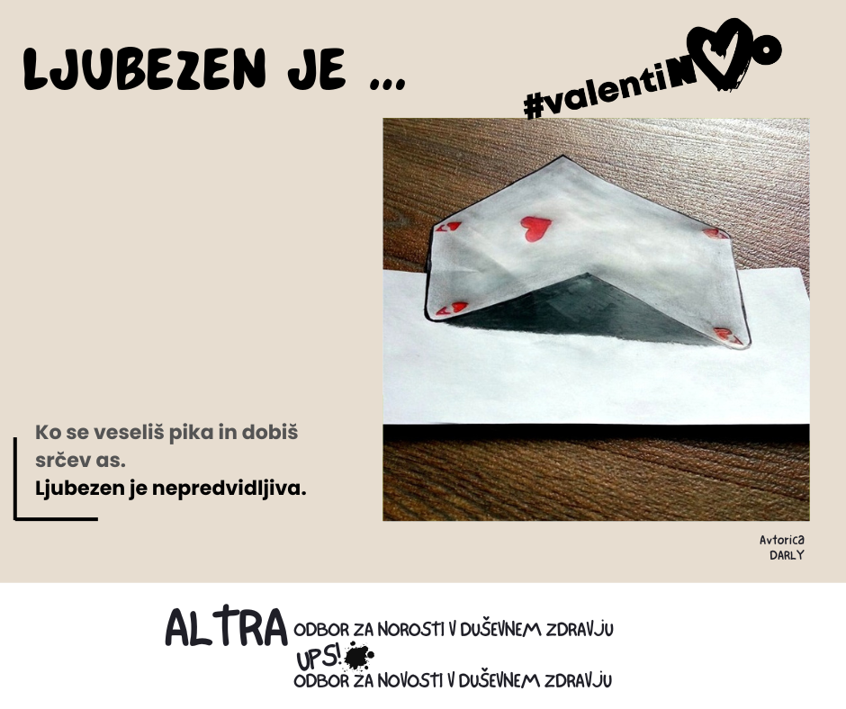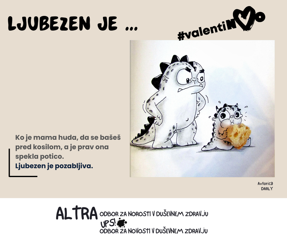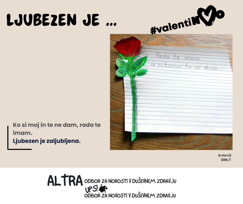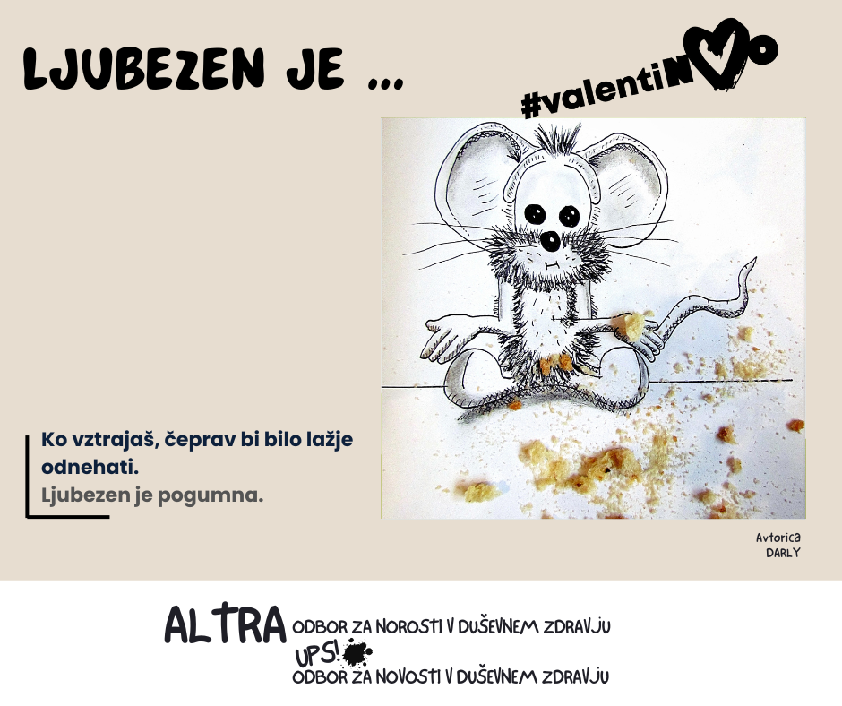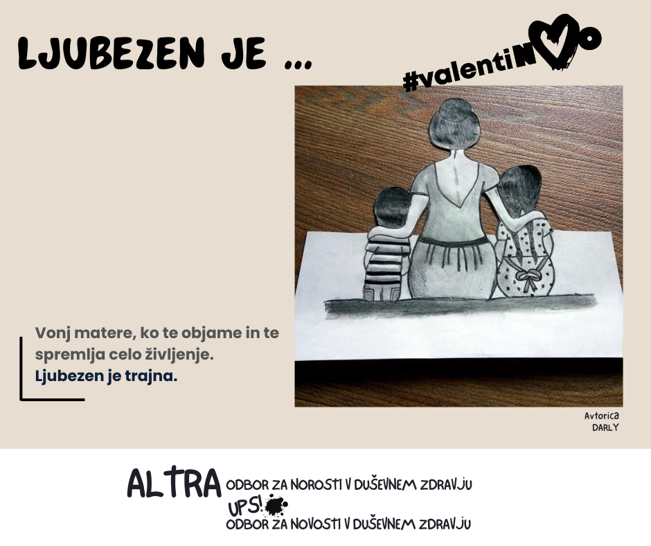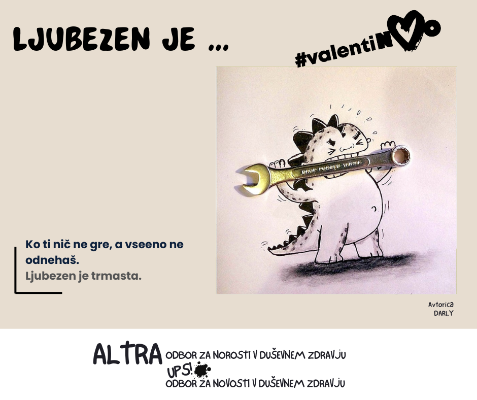 Altrina valentinova kampanja je na poziv CNVOS nastala kot nagovor različnim oblikam ljubezni – tistim tihim, zapletenim, vsakdanjim, veselim in humornim in včasih tudi nerodnim. Ljubezni do sebe, do drugih, do skupnosti, do sprememb. Vsem tistim oblikam ljubezni, ki so tesno povezane tudi z duševnim zdravjem. Odločili smo se za nameren odmik od prevzetega romantičnega razumevanja ljubezni, ki ga zapoveduje potrošniški način praznovanja na dan, ko praznuje svoj god sveti Valentin – valentinovo.