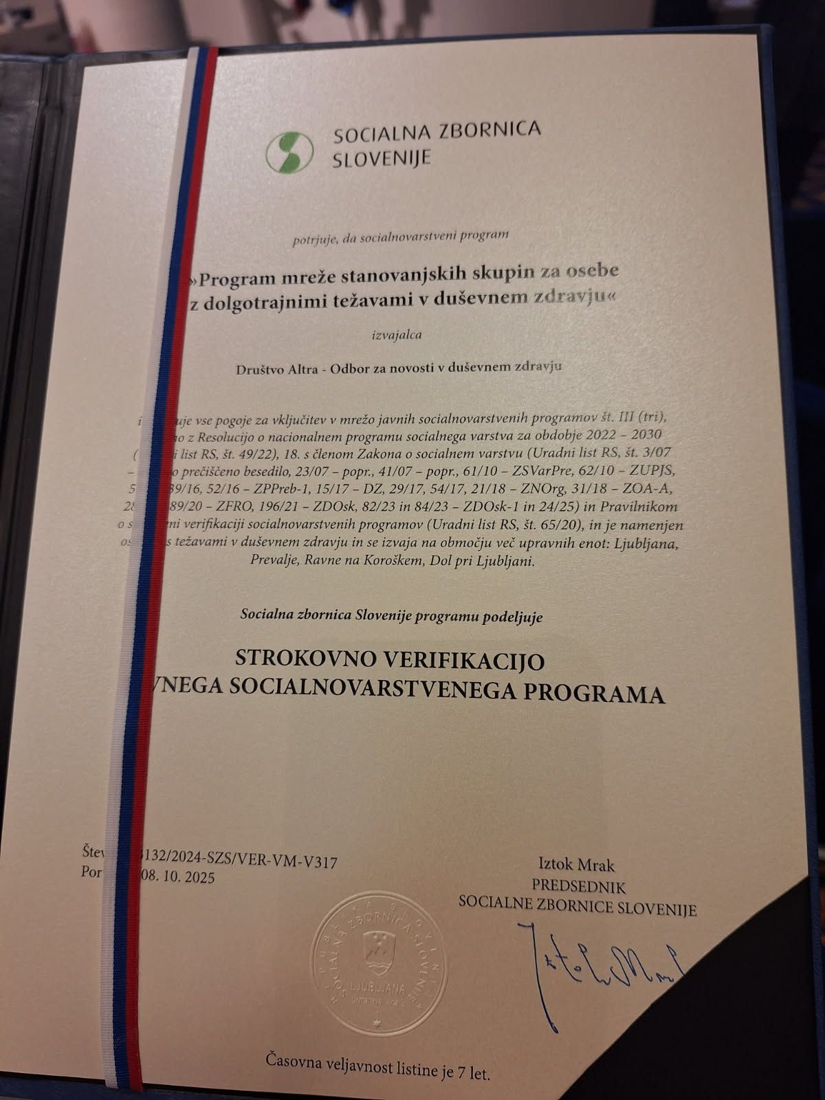 Na 31. dnevih Socialne zbornice Slovenije, ki so potekali 8. oktobra 2025 v Portorožu, je Društvo Altra prejelo verifikacijsko listino za program Mreže stanovanjskih skupin za osebe z dolgotrajnimi težavami v duševnem zdravju.