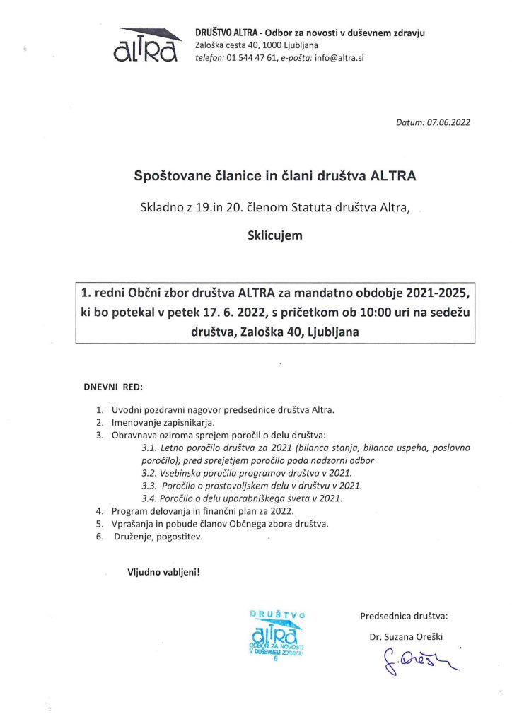 v petek 17.6.2022 bo potekal 1. redni občni zbor Društva Altra za mandatno obdobje 2021-2025.