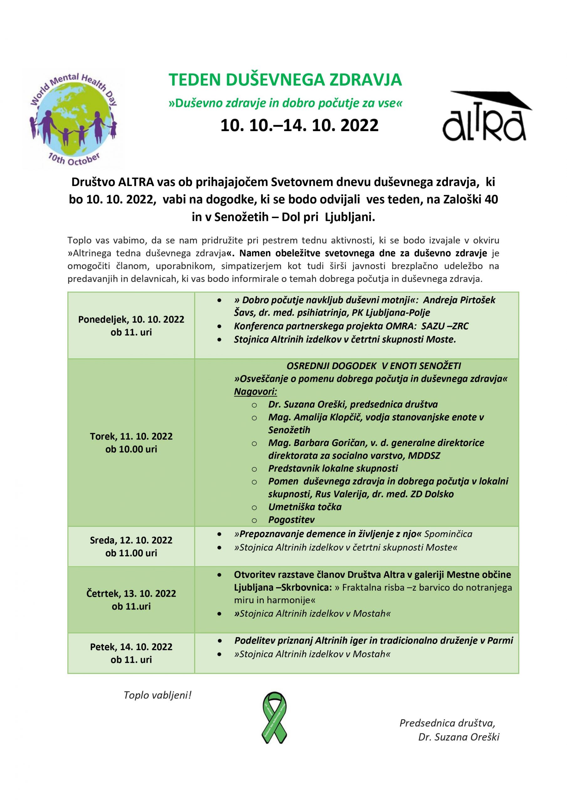 Toplo vas vabimo, da se nam pridružite pri pestrem tednu aktivnosti, ki se bodo izvajale v okviru »Altrinega tedna duševnega zdravja«.