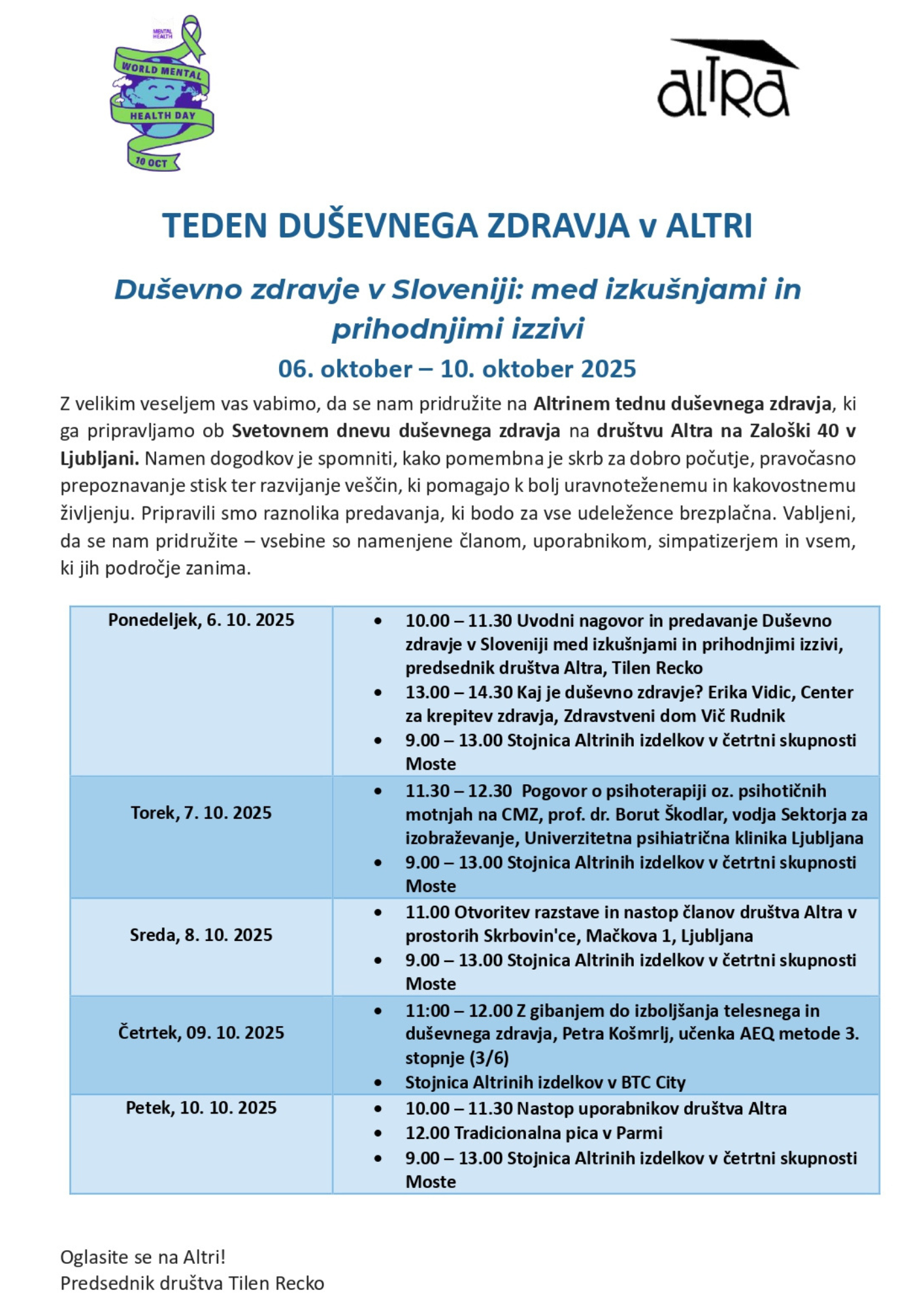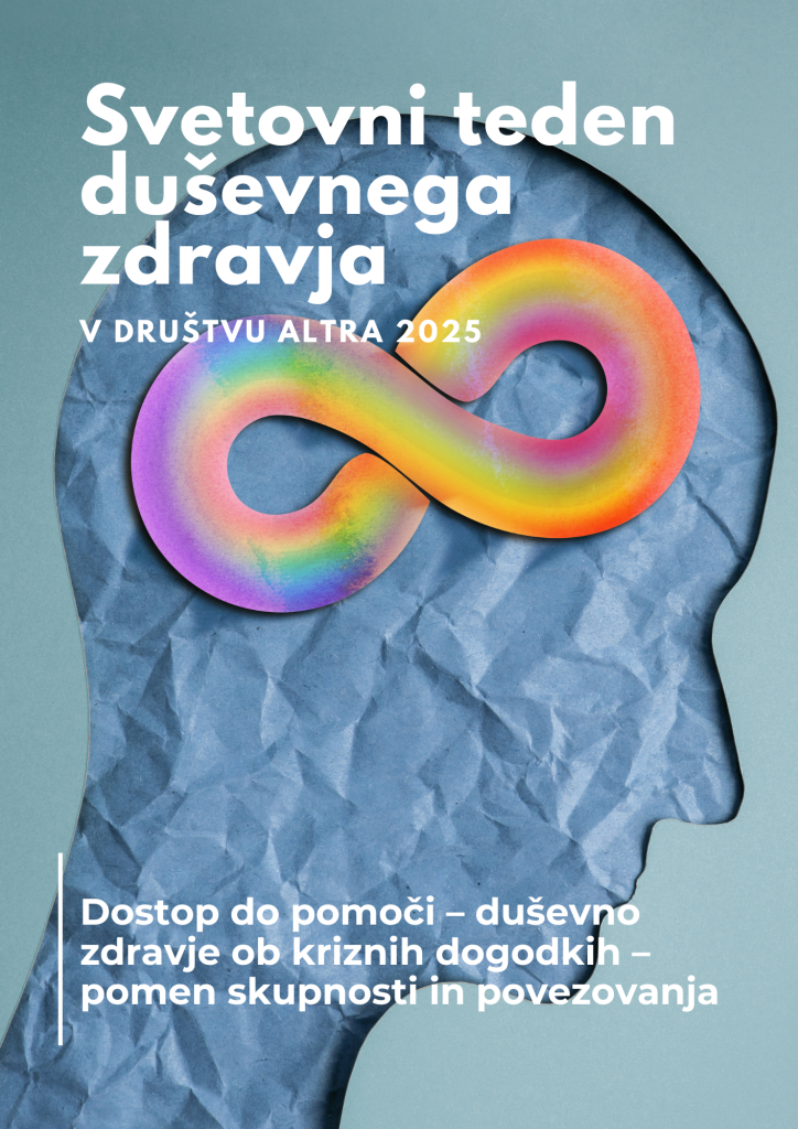 Društvo Altra tudi letos obeležuje Svetovni dan duševnega zdravja s tednom strokovnih in kulturnih dogodkov. Med 06. in 10. oktobrom 2025 bo na sedežu društva na Zaloški 40 v Ljubljani ter na drugih lokacijah potekal program, namenjen ozaveščanju in krepitvi pomena skrbi za duševno zdravje.
