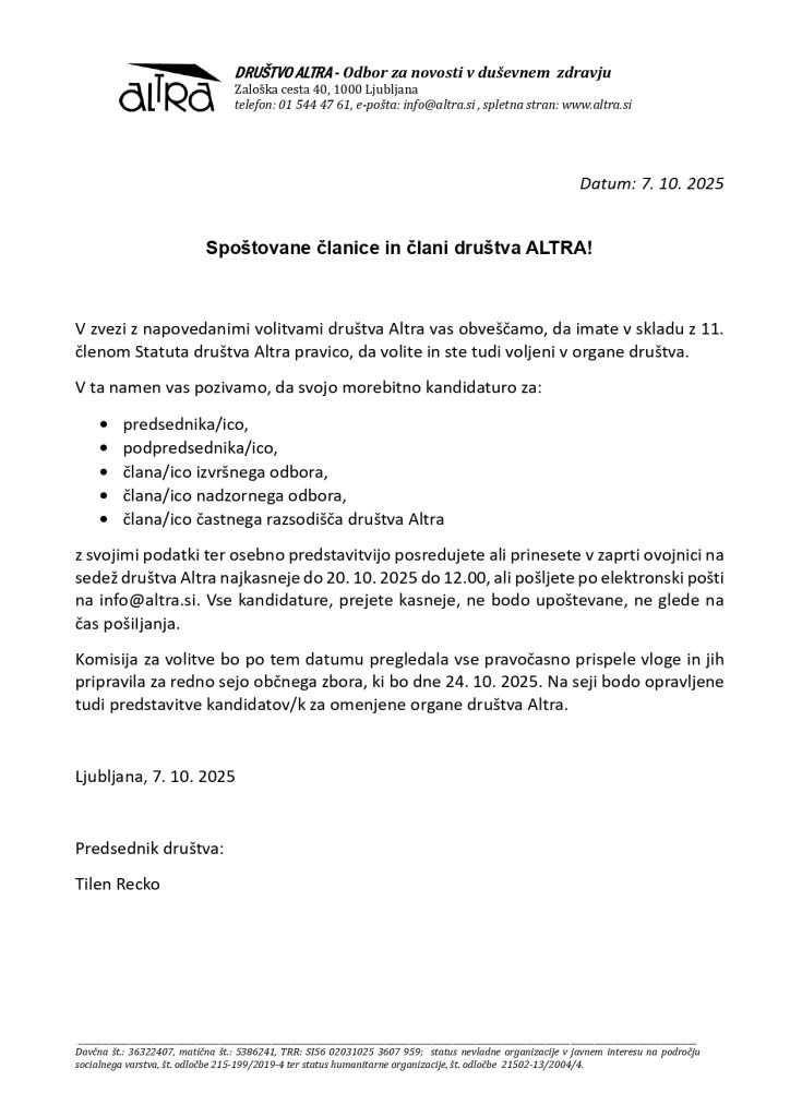 Kandidaturo za funkcije predsednika, podpredsednika, člana izvršnega odbora, nadzornega odbora ali častnega razsodišča je mogoče oddati do ponedeljka, 20. oktobra 2025, do 12.00. Vloge lahko oddate osebno, po pošti ali po elektronski pošti na info@altra.si.