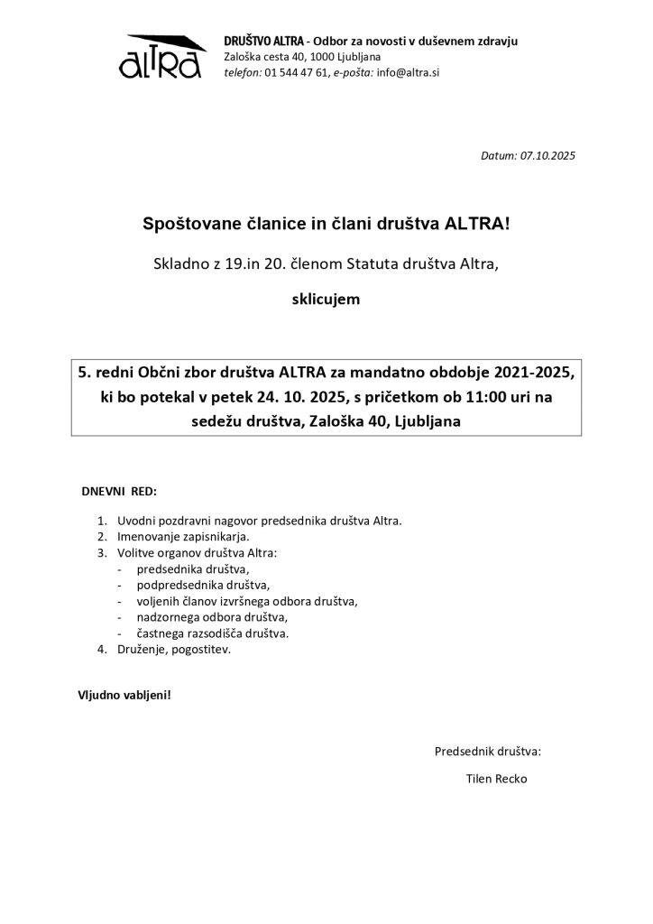 Društvo ALTRA v oktobru organizira volitve organov društva in 5. redni občni zbor, ki bo potekal v petek, 24. oktobra 2025, ob 11. uri na sedežu društva, Zaloška 40, Ljubljana.